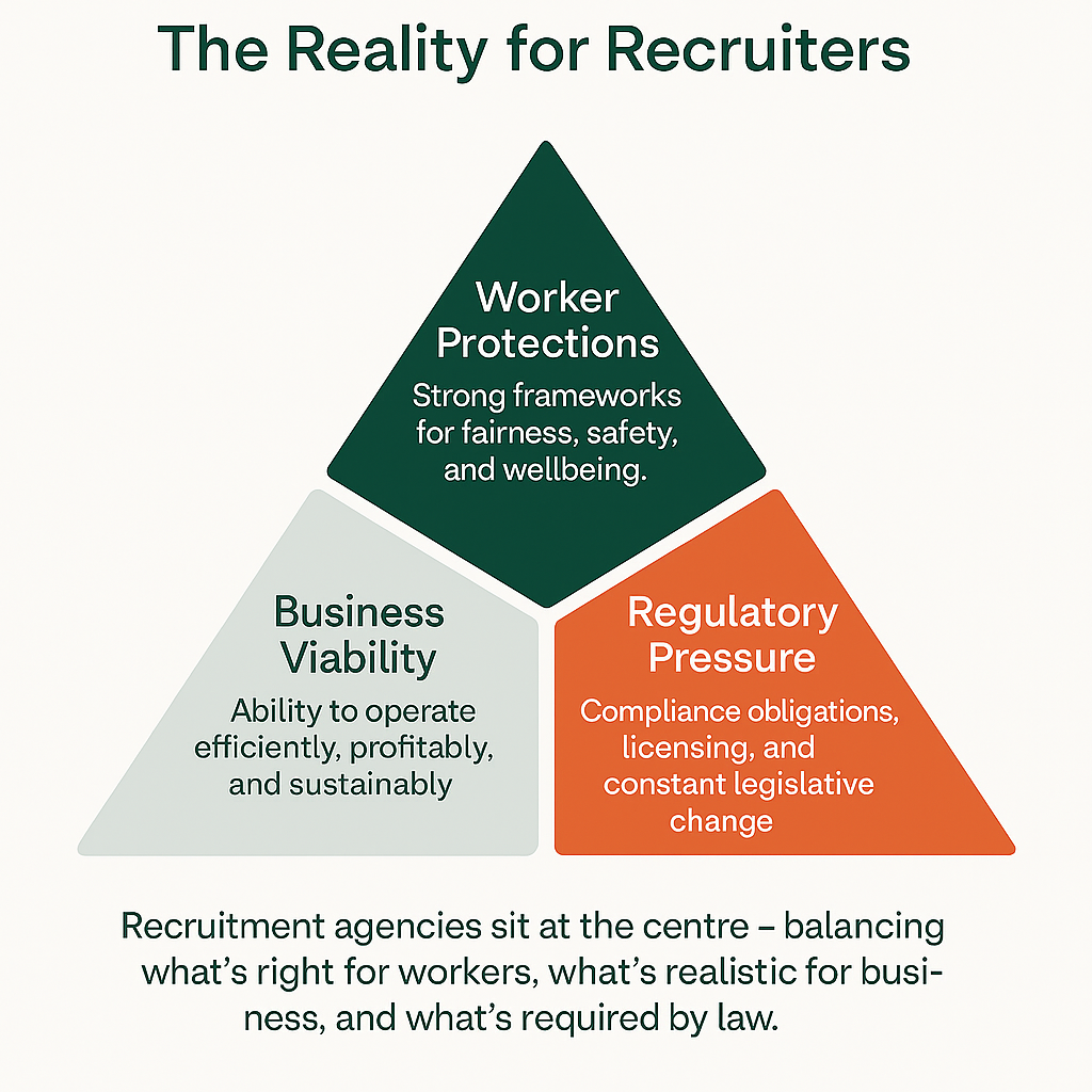 Recruitment agencies sit at the centre, balancing what’s right for workers, what’s realistic for business, and what’s required by law.