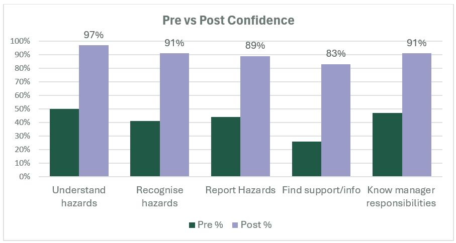 Figure 1: Confidence in understanding, recognising, and reporting psychosocial hazards improved dramatically after training.