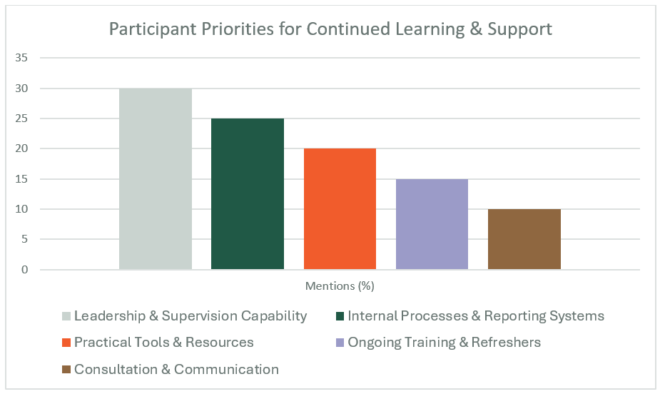 Figure 2: Participant priorities for continued learning and support, highlighting leadership capability, internal processes, and practical tools as top needs.